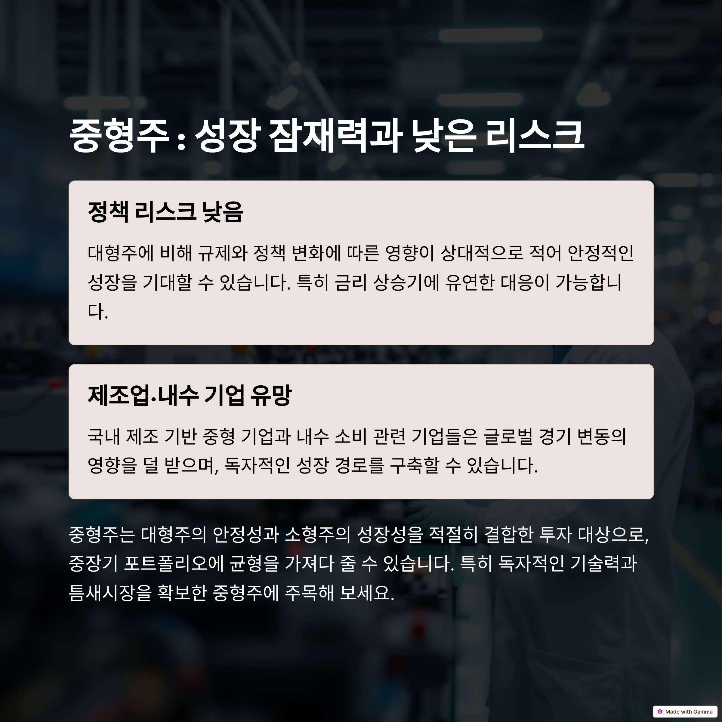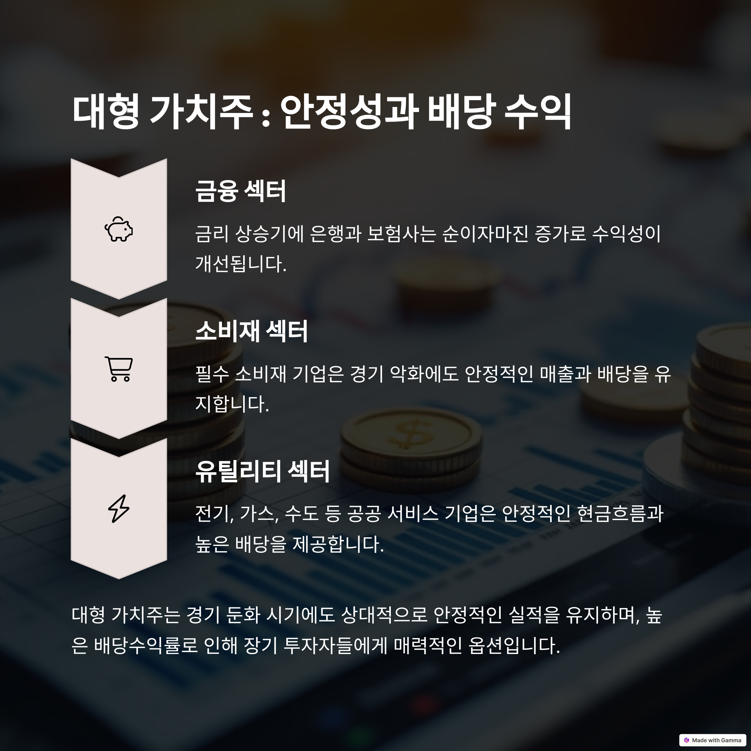 대형 가치주는 금리 상승기에도 꾸준한 실적을 기대할 수 있습니다. 금융, 소비재, 유틸리티 섹터의 대형주는 현금흐름이 안정적이며, 금리 변동에 대한 대응력이 강합니다.