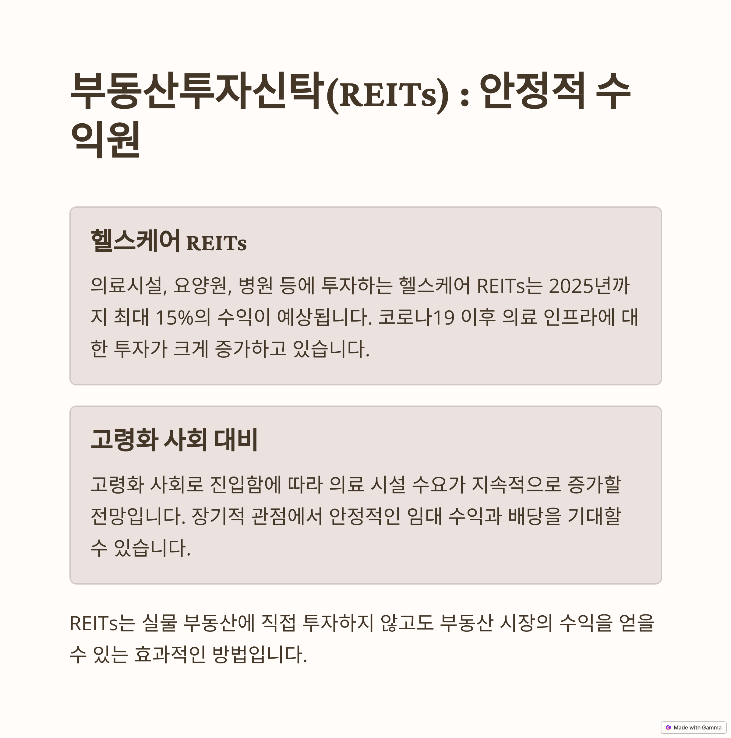 한편, 부동산투자신탁(REITs)도 주목할 만한 자산입니다. 특히 헬스케어 REITs는 고령화 사회에서 지속적인 성장을 기대할 수 있습니다.