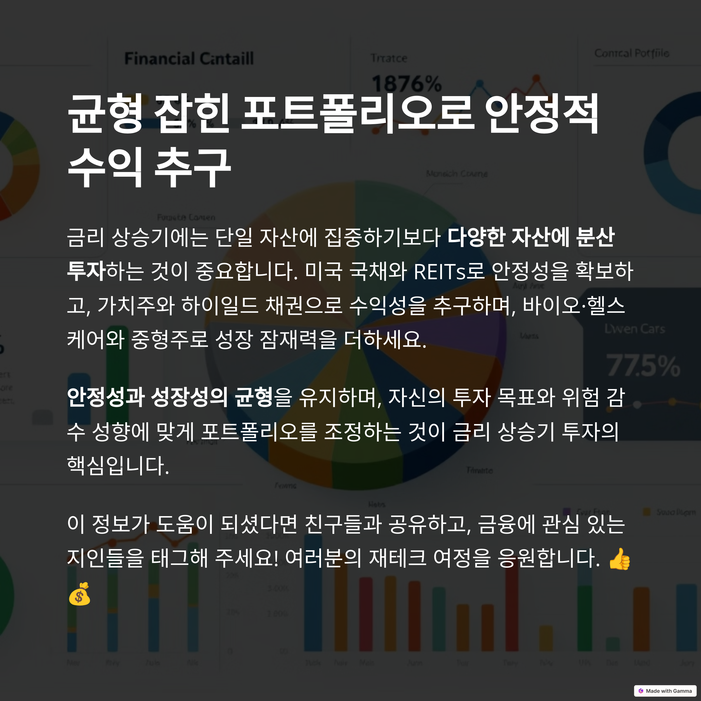 금리 상승기에는 신중한 투자 전략이 필요합니다. 미국 국채, REITs, 대형 가치주와 같은 안정적인 자산을 확보하면서도 금, 바이오 및 헬스케어 등 성장 가능성이 높은 섹터에도 관심을 가져야 합니다.