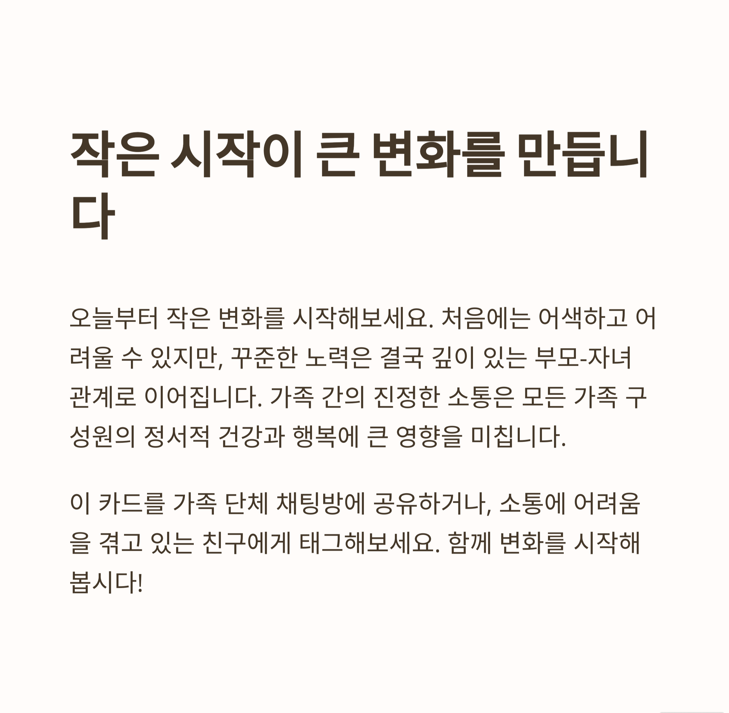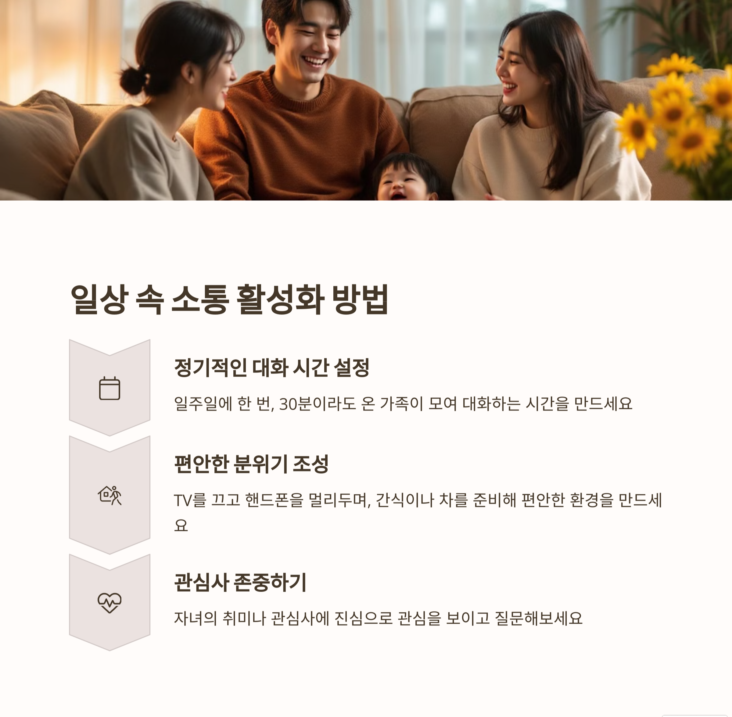 | 시간 부족, 대화 주제 부족, 부담감 | 경청, 감정 표현, 공감 연습 | 주 1회 가족 대화 시간 정하기 |