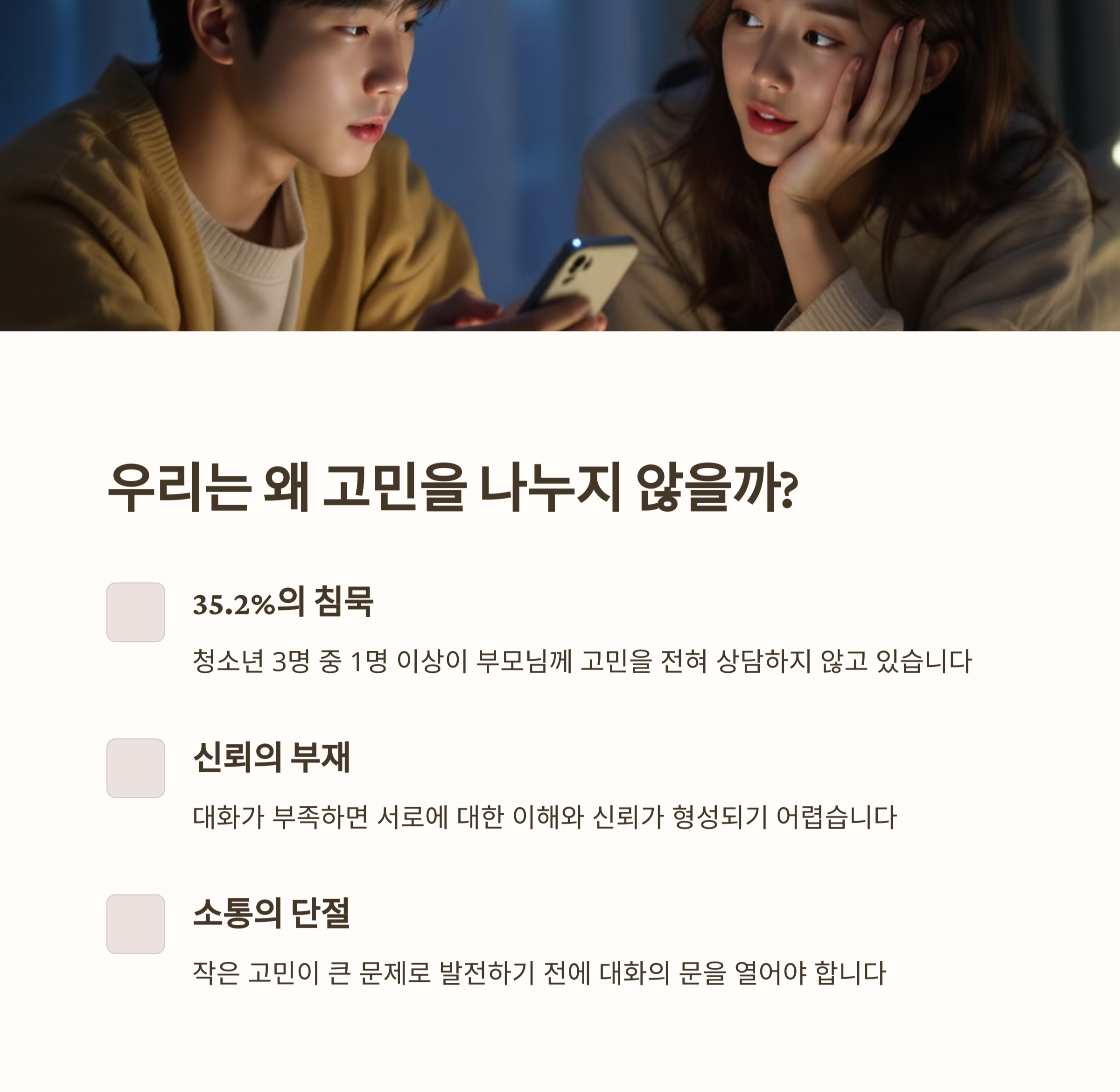 | 대화 감소 원인 | 청소년과 부모 간 대화 시간이 줄어드는 이유를 분석합니다. |